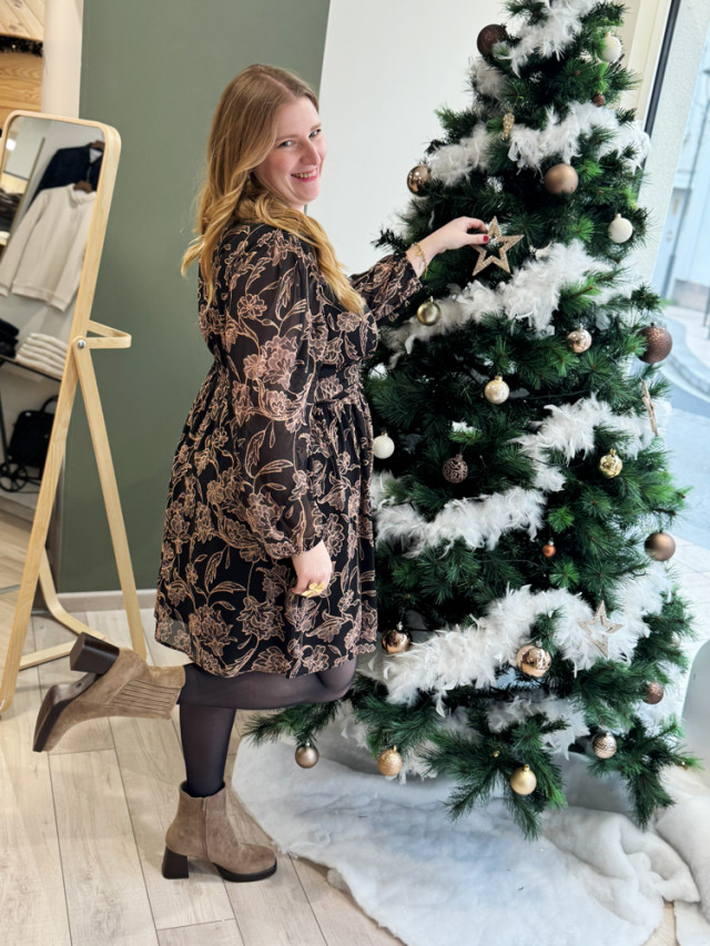 Apportez une touche d’élégance et de fraîcheur à votre garde-robe avec cette robe courte noire ornée de délicates fleurs camel. Sa coupe flatteuse convient à toutes les morphologies