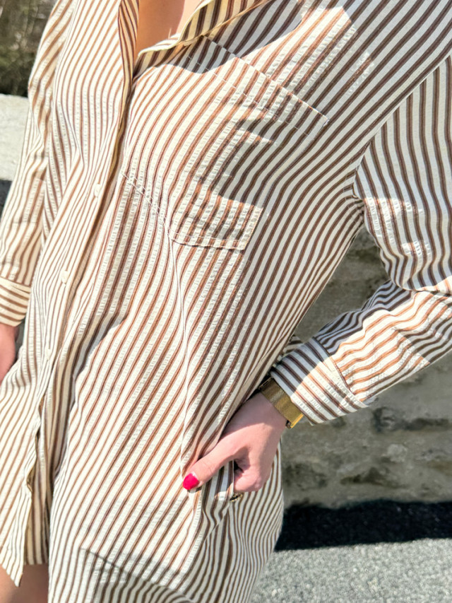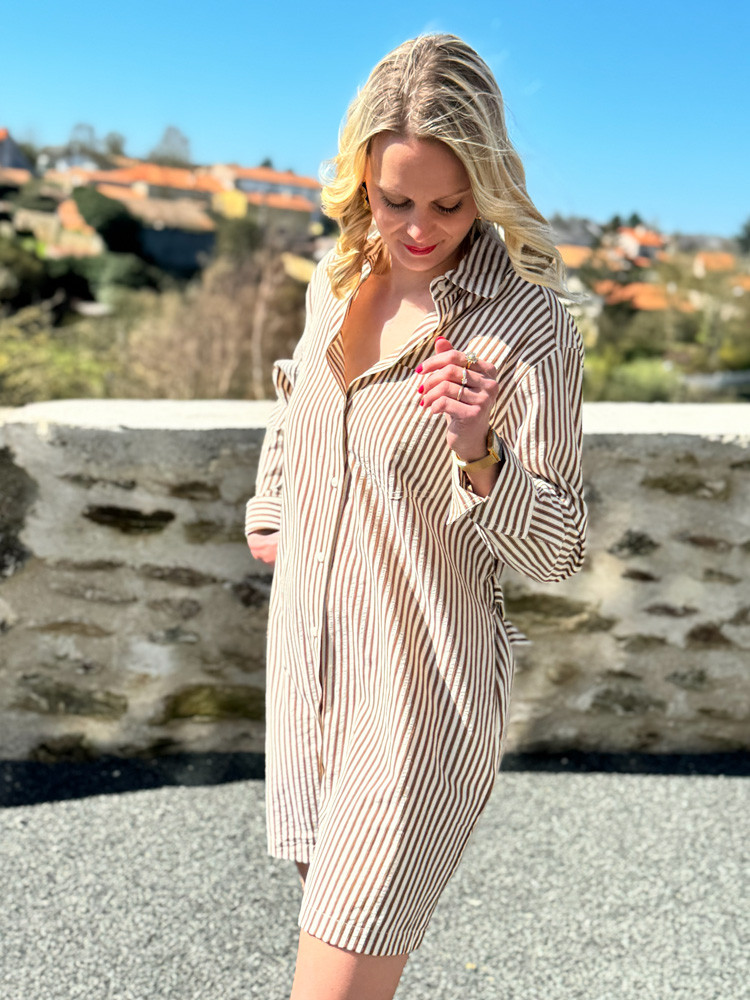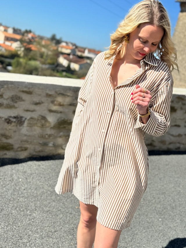 Succombez au charme naturel de cette robe courte rayée marron signée Grace & Mila. Avec son jeu de rayures intemporel et sa teinte terreuse chaleureuse, elle incarne l'élégance décontractée propre à la marque parisienne.