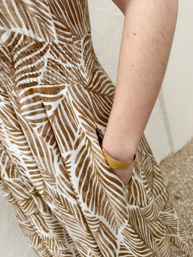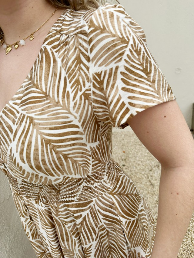 Signature de chez Molly Bracken, cette robe longue s'habille d'un motifs feuillage camel doux et lumineux. Agréable à porter et féminine, elle épouse parfaitement votre silhouette.