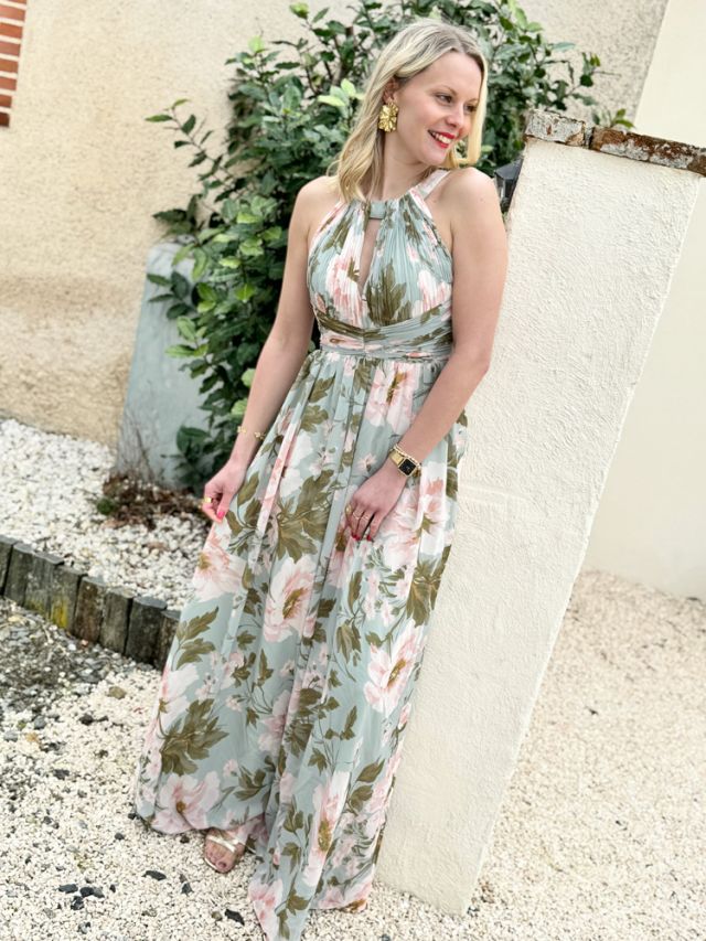 Romantique, lumineuse et féminine, cette robe longue verte à imprimé fleurie rose est une pièce parfaite pour vos occasions estivales. Bustier ajusté par son lien au cou, dessine votre silhouette et convient à toutes morphologie.