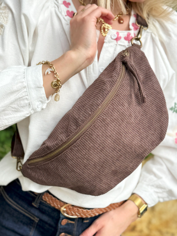 Grand sac banane en velours côtelé marron pour emportez avec vous tout votre nécessaire