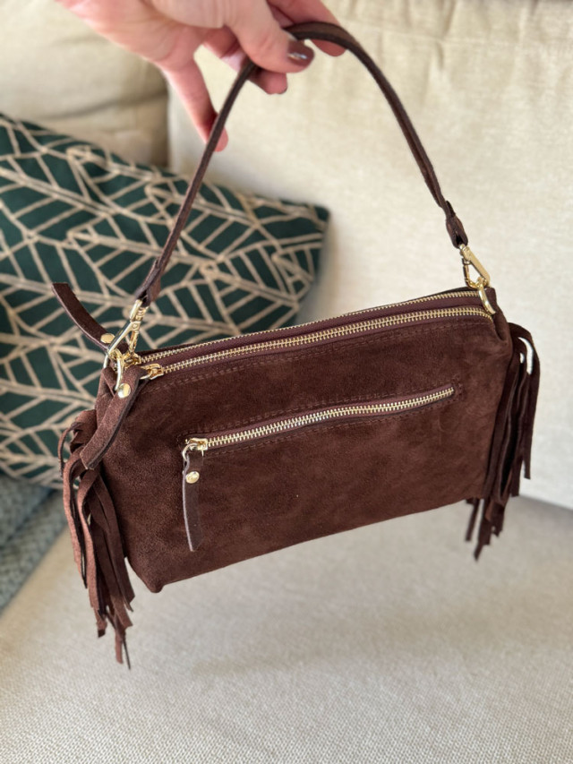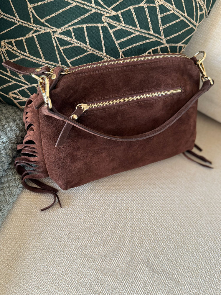 Affirmez votre style avec ce sac en cuir véritable orné de franges latérales, une pièce tendance qui allie caractère et féminité.