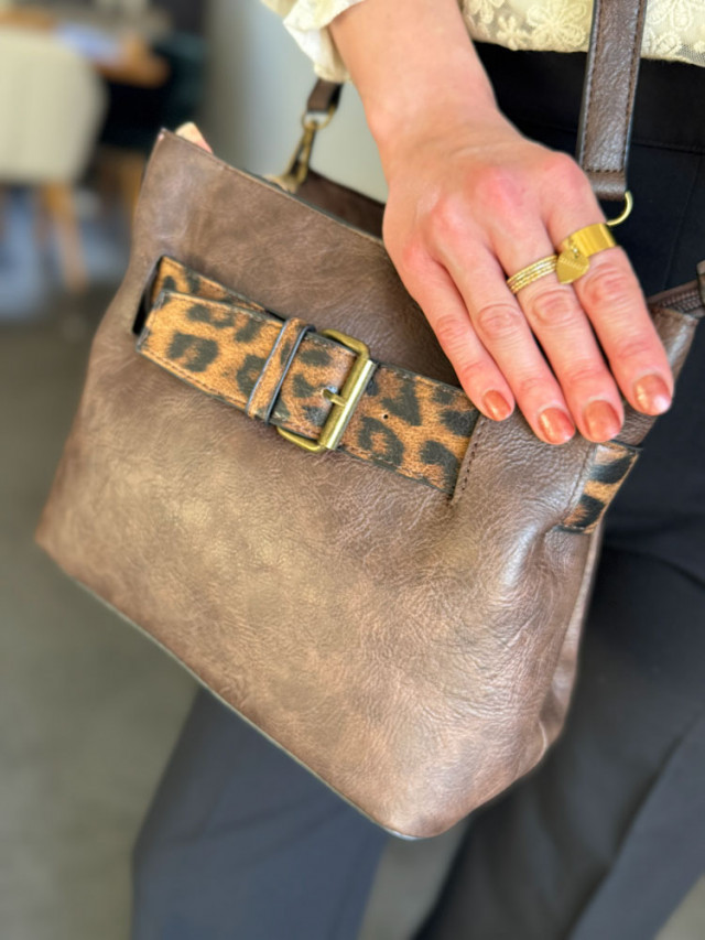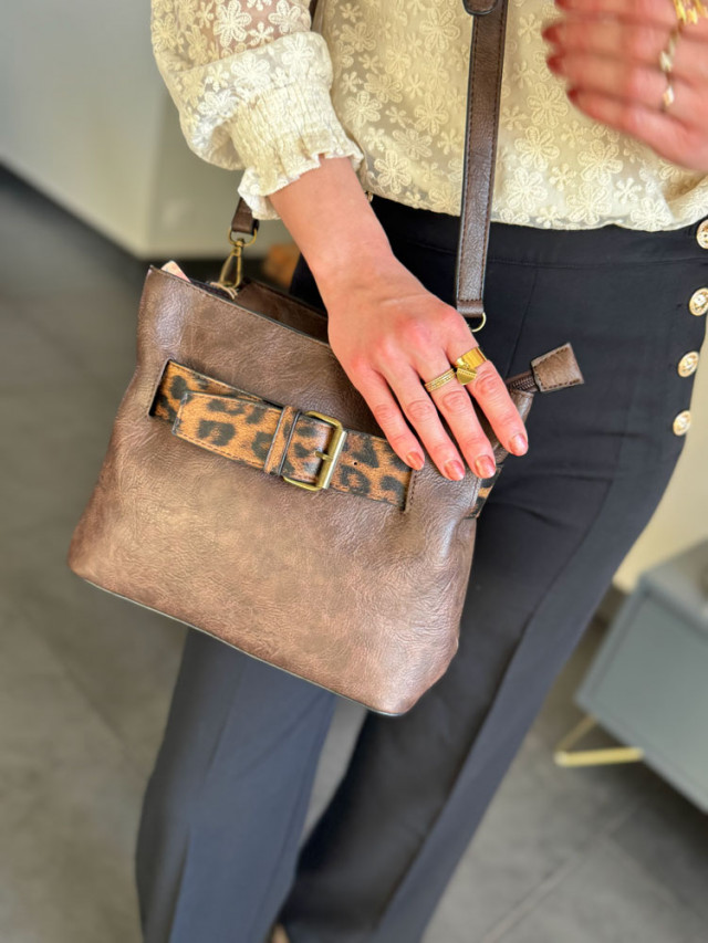 Apportez une touche d’originalité à votre look avec ce sac à main marron orné d’une boucle fantaisie imprimé léopard, pour un style à la fois chic et audacieux.