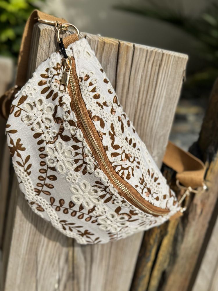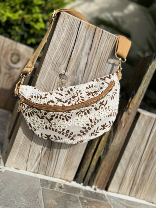 Optez pour ce sac banane revisité orné de broderie anglaise marron et blanc. Pièce moderne et indispensable pour vos sorties.