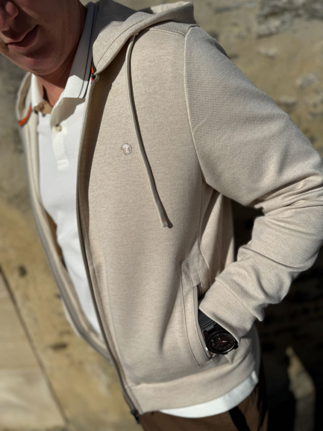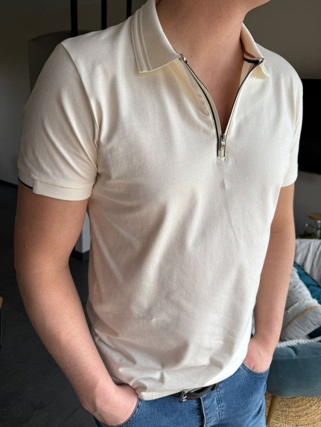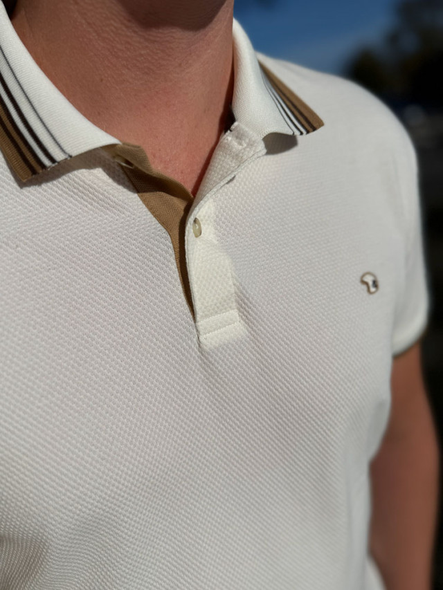 Le Polo Benson Gazo est l'équilibre parfait entre confort et prestige. Sa teinte beige sobre est rehaussée par des liserés marron contrastés sur le col et les manches, offrant une silhouette structurée et moderne.