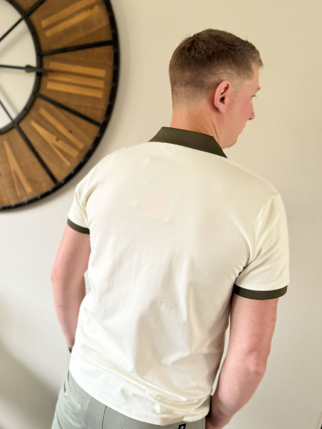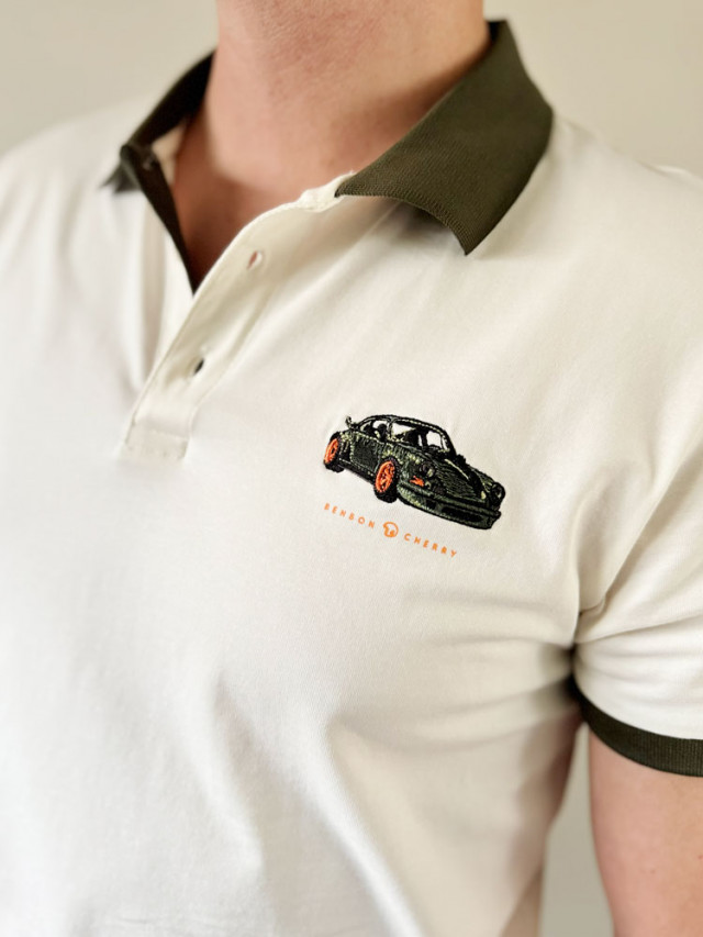 Alliez le style preppy à une touche d'originalité automobile avec ce polo Benson & Cherry. Sa teinte beige élégante est contrastée par un col kaki audacieux, tandis que l'illustration d'une voiture sur la poitrine apporte une note vintage unique. Un indispensable pour un look décontracté mais soigné.