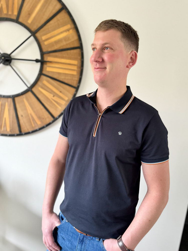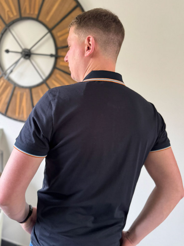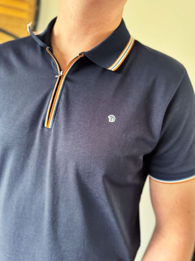 Dynamisez votre vestiaire avec ce polo bleu marine revisité. Équipé d'une fermeture zippée au col plutôt que des boutons classiques, il arbore un liseré orangé contrastant et un col revers raffiné.