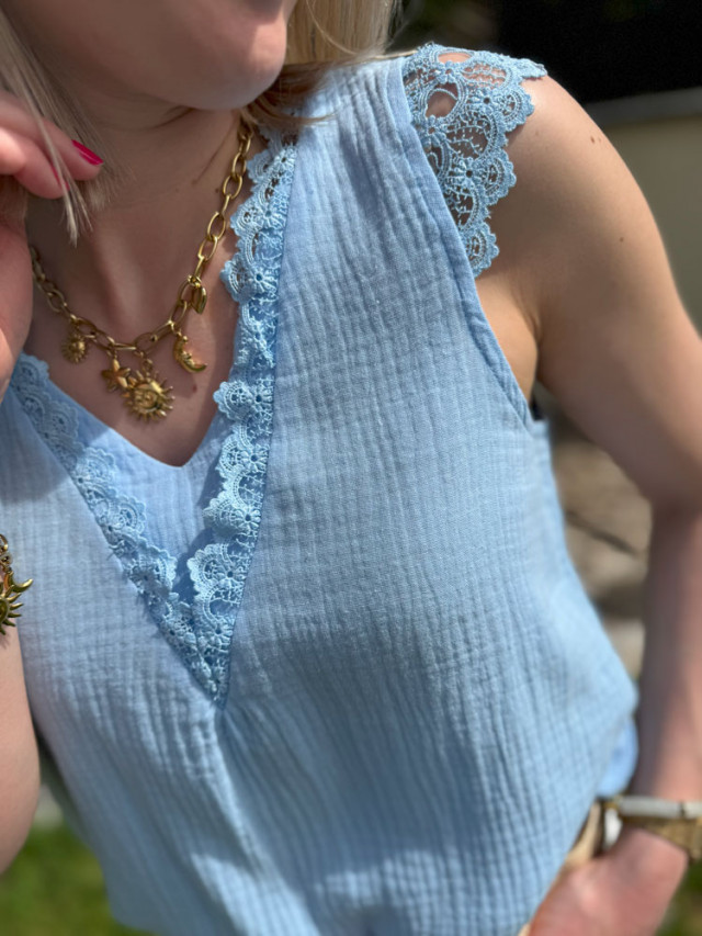 L'indispensable pour cet été, ce débardeur uni en gaz de coton sera parfait pour les journées estivales. Sa finition en dentelle apportera une touche féminine à votre tenue