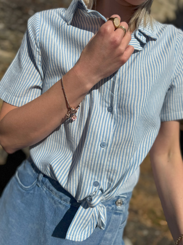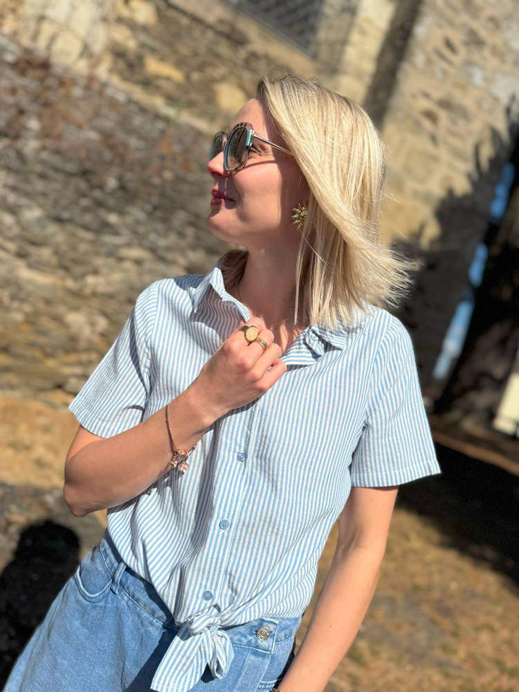 Laissez vous séduire par le charme intemporel de ce chemisier rayé bleu et son nœud à la taille qui cintrera votre silhouette.