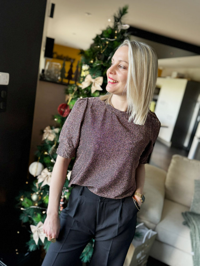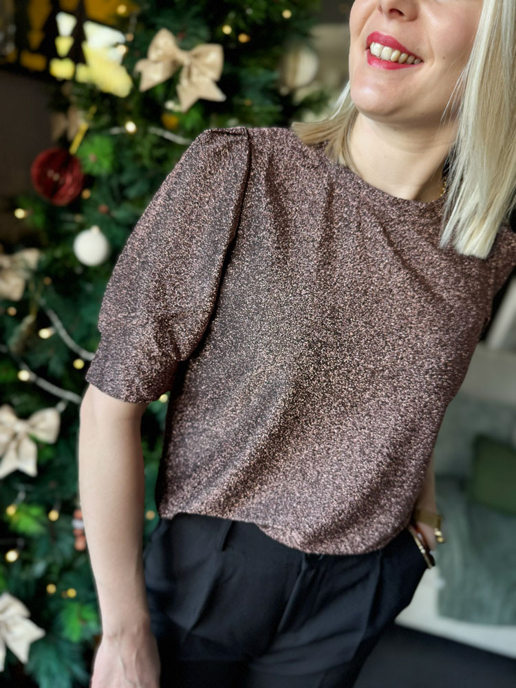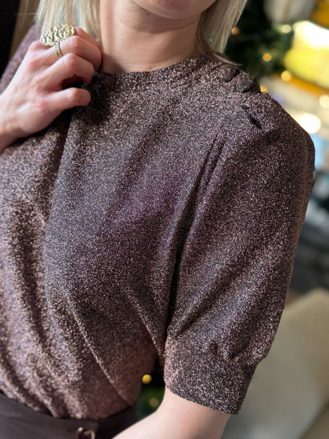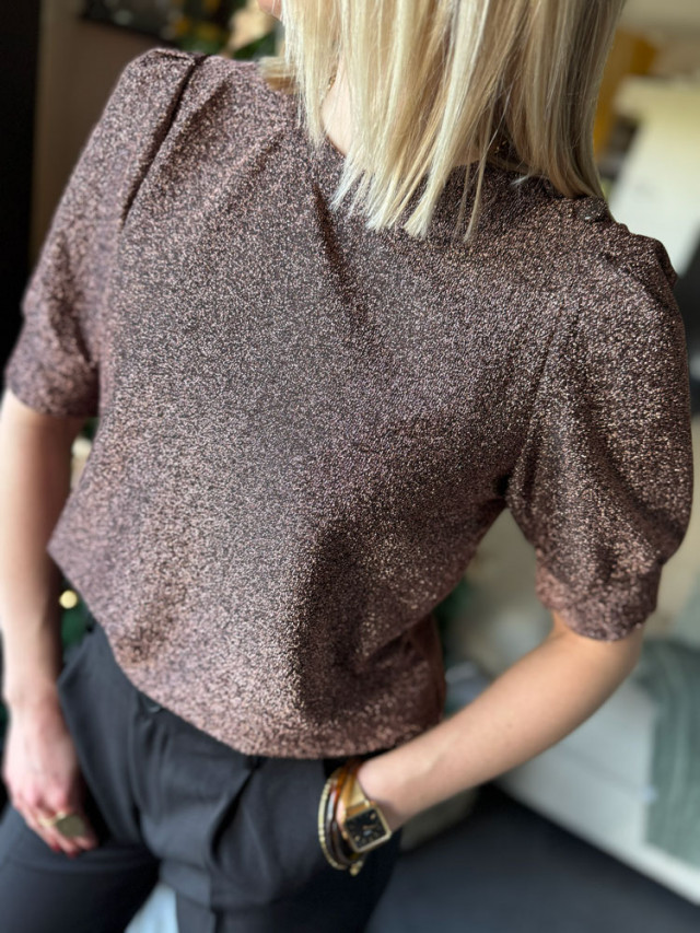 Brillez en toutes occasions avec ce top manches courtes bronze à paillettes. Parfait pour soirées, fêtes et événements tendance.