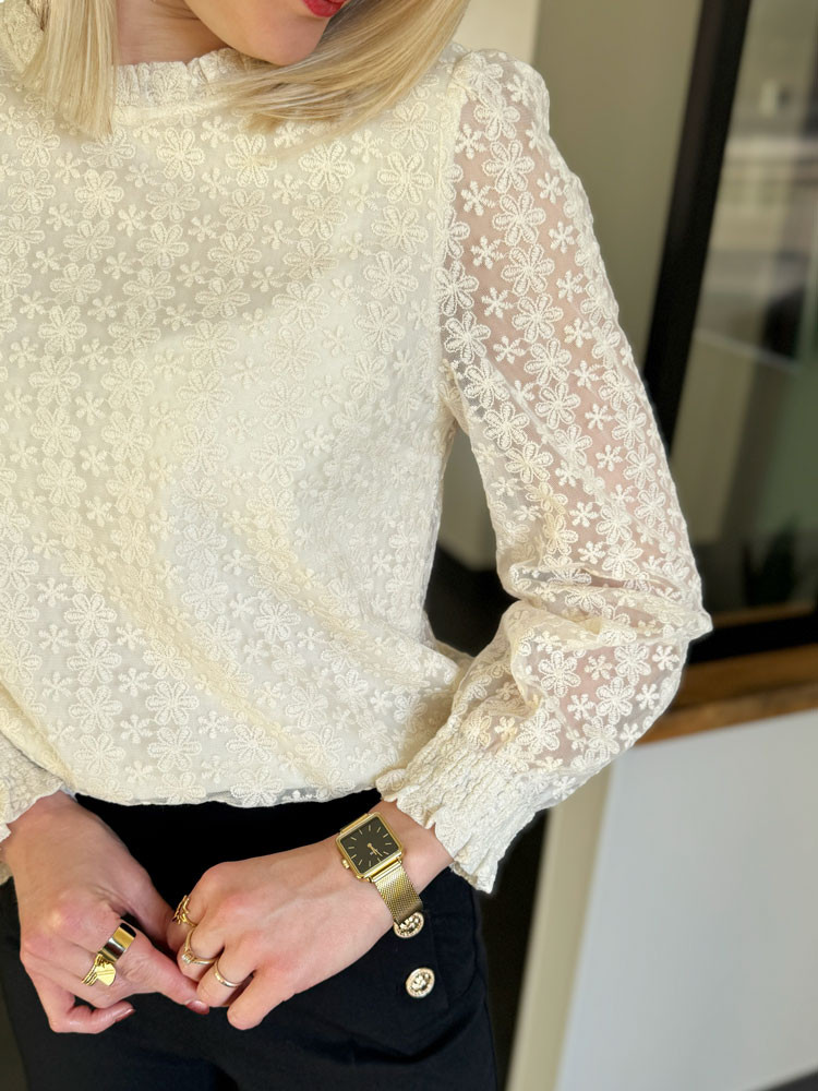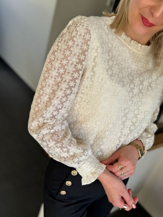 Apportez une touche chic à votre tenue avec ce top beige à dentelle fleurie. Parfait pour un look raffiné, au quotidien ou pour des occasions spéciales.