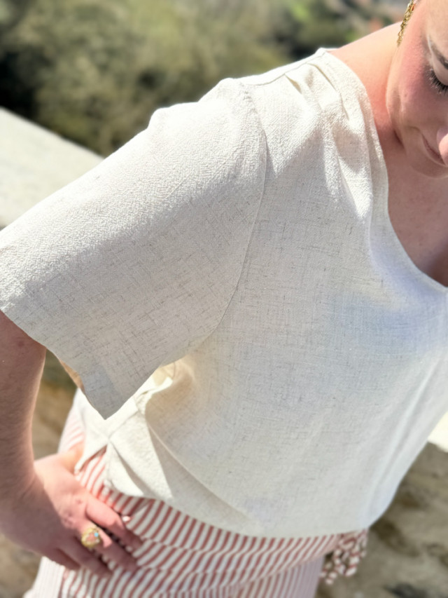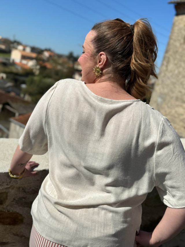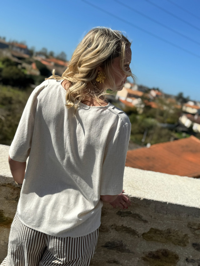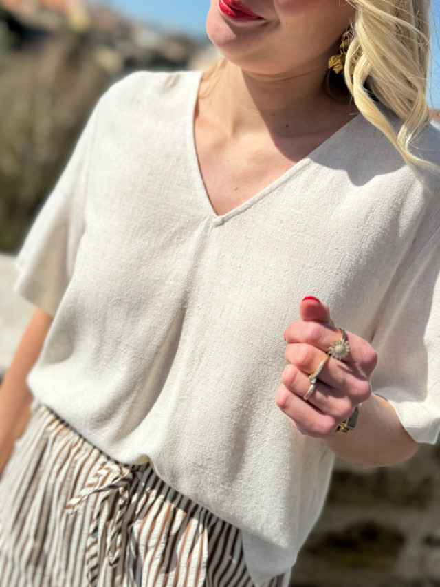 L'élégance réside dans la simplicité avec notre top beige fluide. Ce haut aérien, à la teinte sablée universelle, est la base idéale de toutes vos tenues.