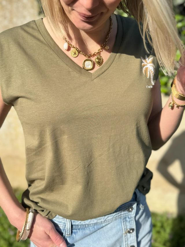 Ce t-shirt classique de la marque C'est beau la vie sera votre indispensable pour cet été. Avec son palmier doré qui apporte une touche de fantaisie à la pièce, il sera votre allié pour vos tenues estivales.