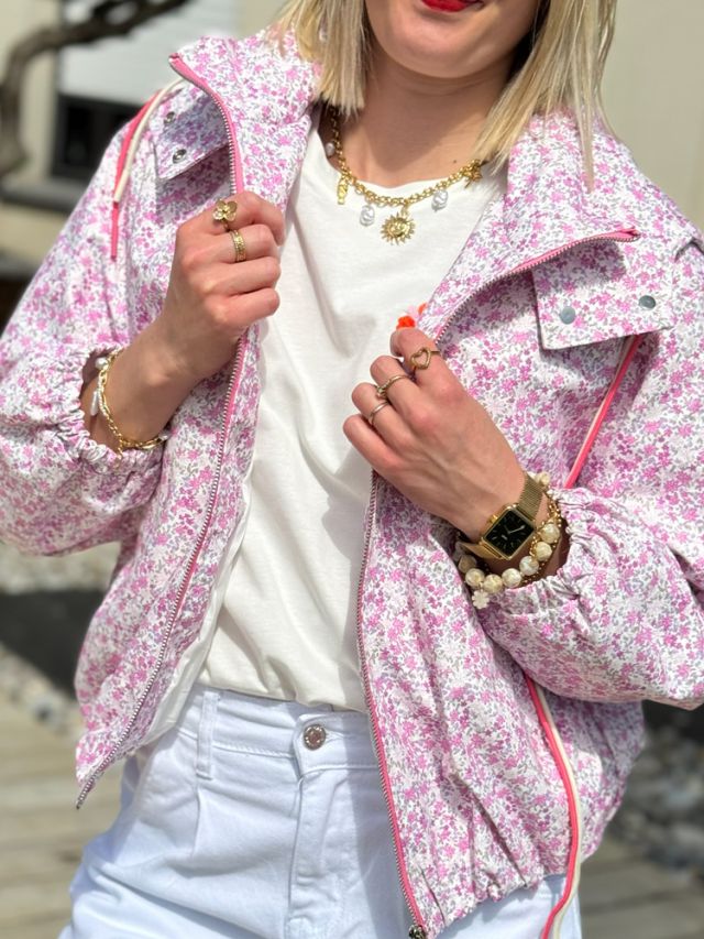Ce blouson fleuri à capuche allie protection déperlante et féminité pour vous accompagner au quotidien.
