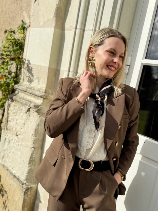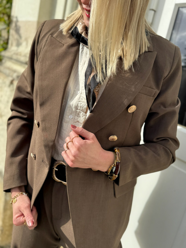 Élégante et affirmée, cette veste tailleur à boutons officiers revisite le classique du dressing féminin avec une touche sophistiquée.