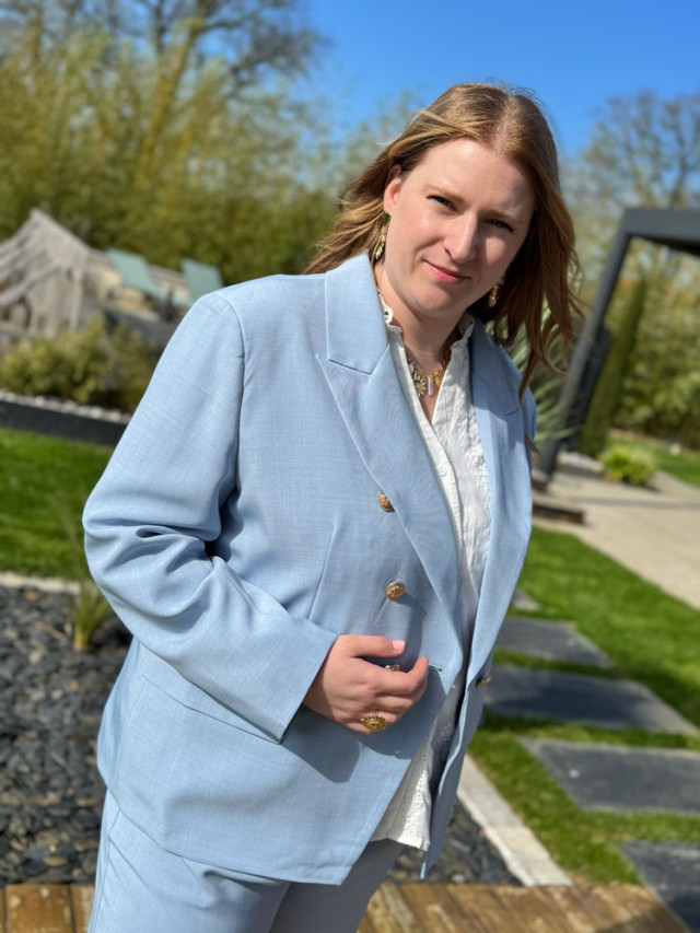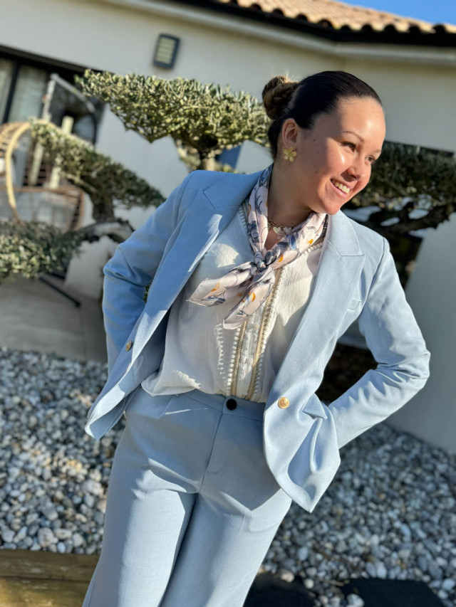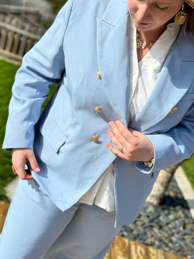 Sublimez votre allure avec notre veste tailleur aux boutons dorés style officiers.
