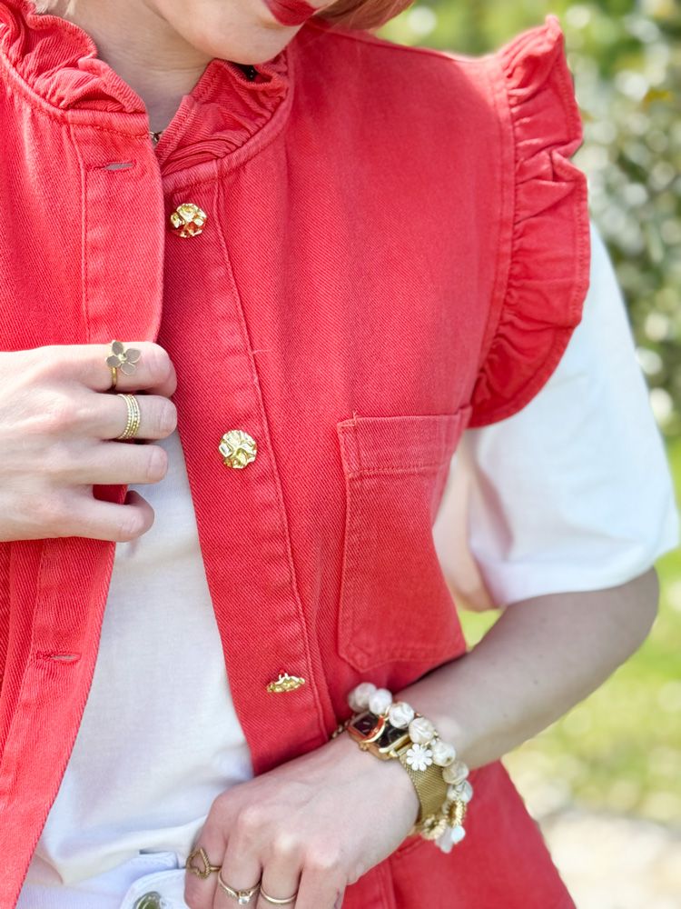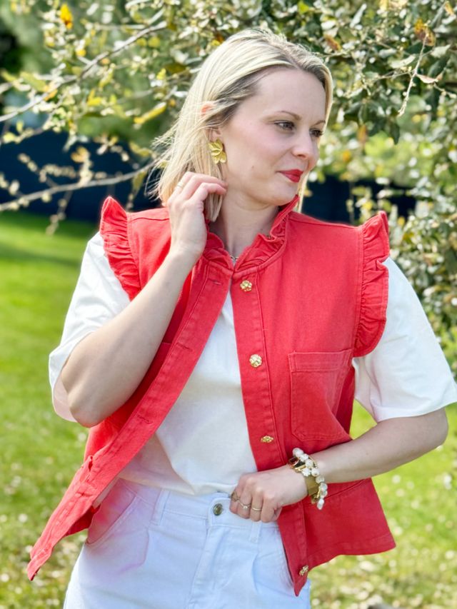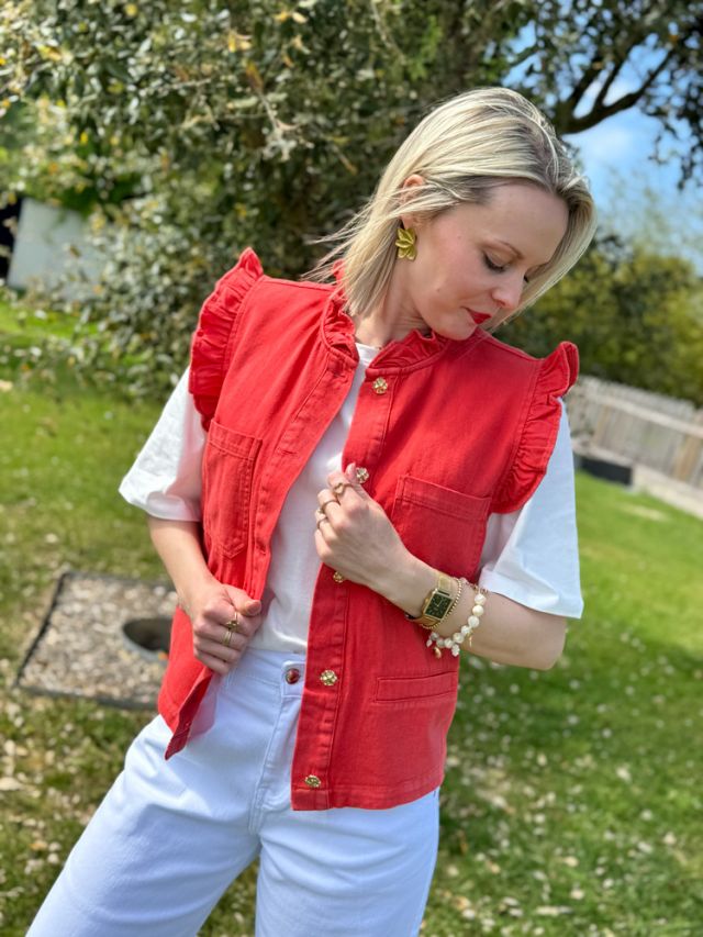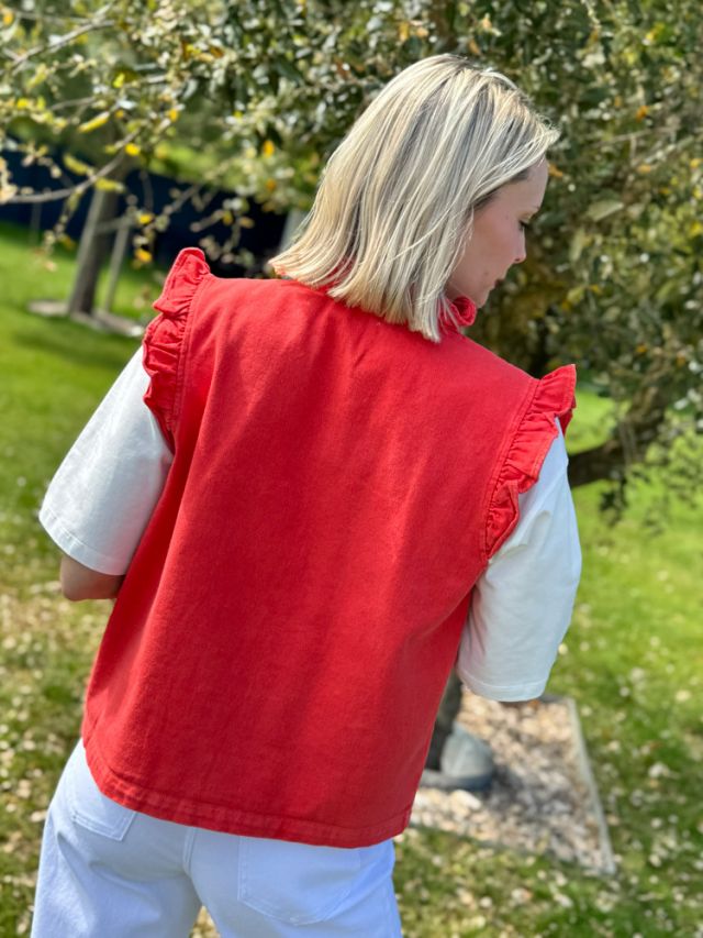 Le sans manches qu'on ne quitte plus. Cette veste sans manches volantés au look casual chic se porte sur tous les looks. Décliné en 2 coloris, vous allez l'adorer.